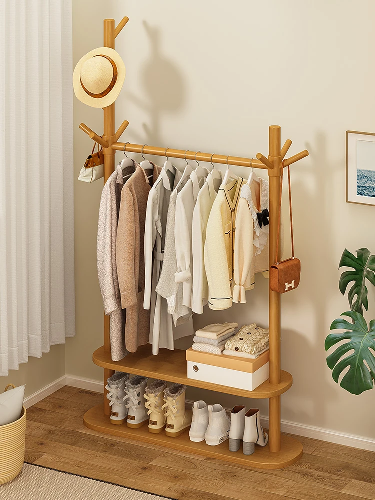 実木製のスタイリッシュなコートハンガー - ベッドルームやリビングにぴったり!シンプルで使いやすい、ダブルレイヤーの収納スペース付き。おしゃれに衣類を掛けて、部屋をスッキリ整理しましょう!